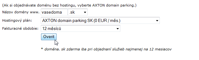V prvej časti, vyplňte názov požadovanej domény, hostingový plán vyberte AXTFONE domain parking. Po kliknutí na tlačítko Overiť, sa overí dostupnost Vašej domény.