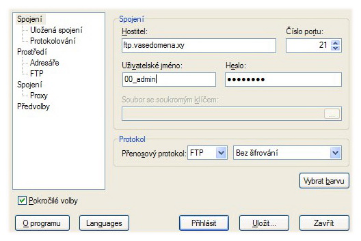 Přenosový protokol: na pevno nastaviť "FTP" a "Bez šifrovanie"